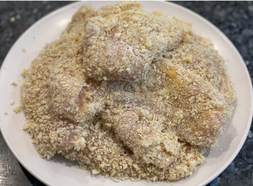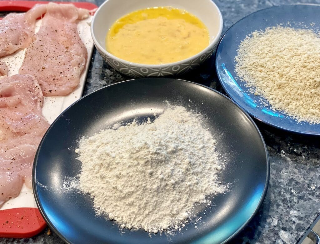 You’ll need 3 flat bowls or large plates sides. In one bowl, lightly whisk the eggs together. Place flour in the second bowl, and panko breadcrumbs in the last bowl.