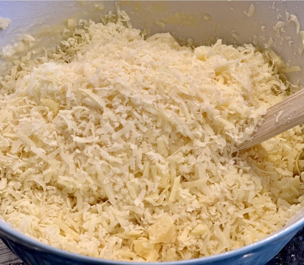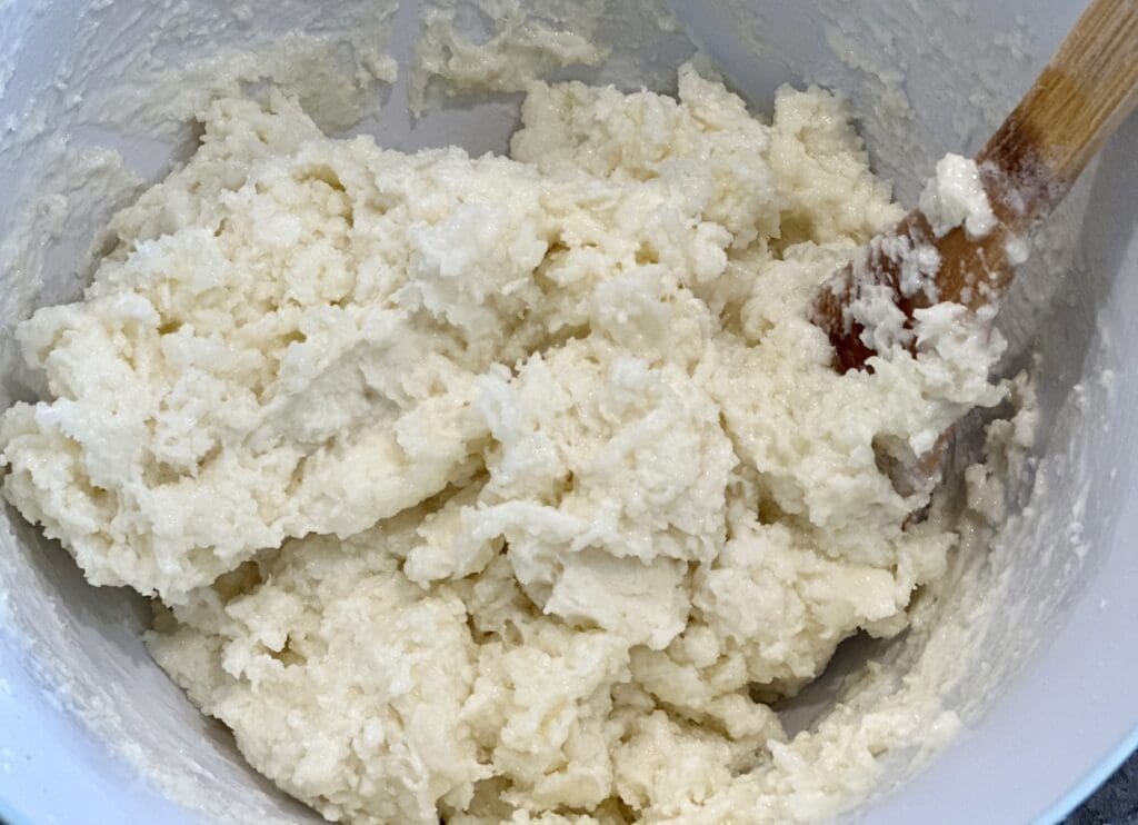 Pour the hot milk mixture over the tapioca starch and stir well to combine. Add in the eggs and continue to stir until combined, then mix in the parmesan and mozzarella cheese. The dough should be quite wet and sticky.