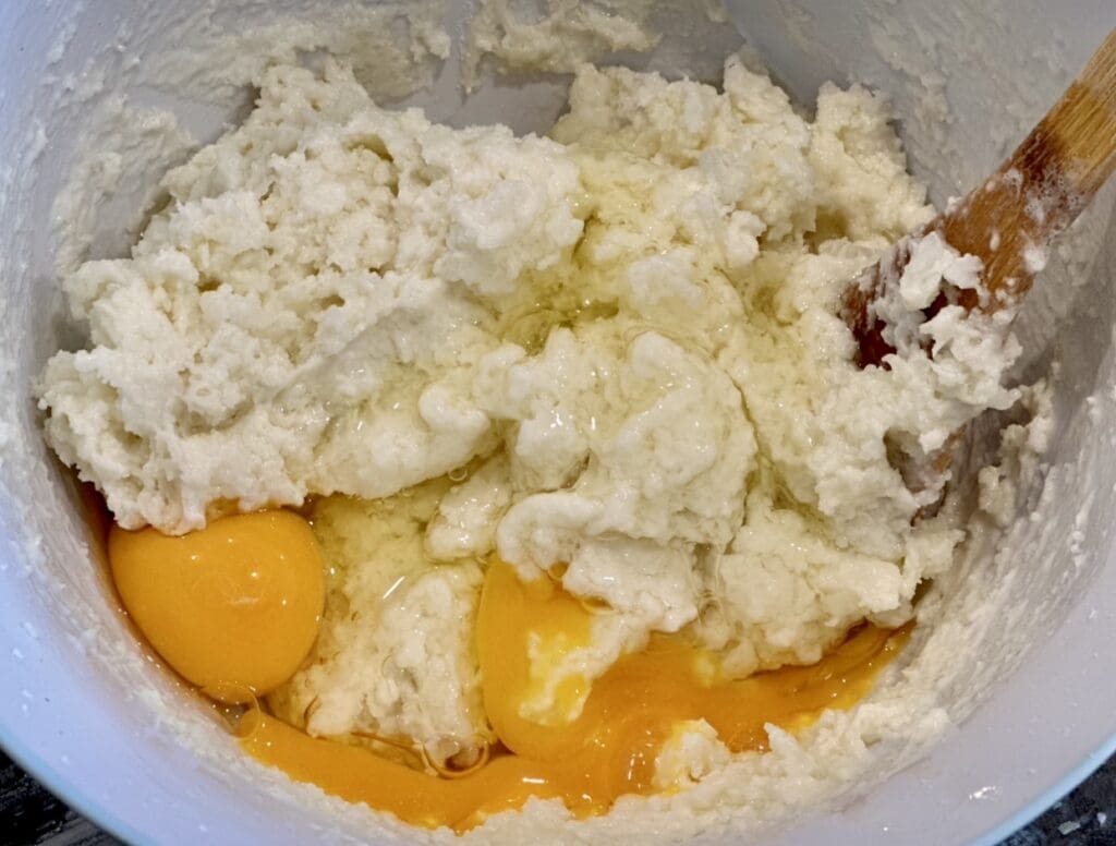 - Pour the hot milk mixture over the tapioca starch and stir well to combine. Add in the eggs and continue to stir until combined, then mix in the parmesan and mozzarella cheese. The dough should be quite wet and sticky.