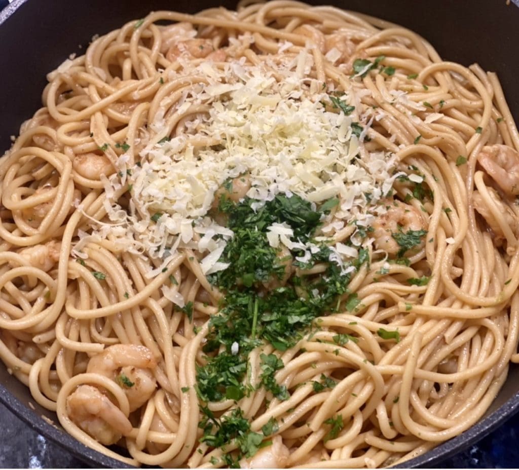 - In the same frying pan, heat the remaining oil over medium to high heat. Add in garlic and spring onions, stir to cook for a minute or until fragrant. Add in the miso and butter, stirring quickly. Once it bubbles and in the wine. Cook until the alcohol smell dissipates, then add in the soy sauce, prawns and pasta. Cook until the pasta has heated through. If it looks a little dry, splash in a tablespoon or more of pasta water to loosen it up. Taste the pasta and add salt or pepper if needed. Give it a stir through and take the pan off the heat. Add in the parmesan and cheese and stir it through the pasta.