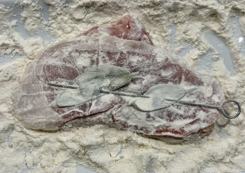 Put chicken on a chopping board, cut side up, and top each piece with a slice of prosciutto. Place two sage leaves over the prosciutto and secure them using toothpicks or skewers. Carefully coat chicken in flour and shake off any excess.