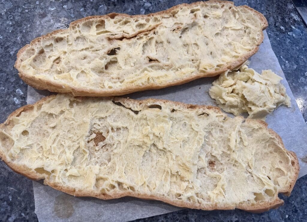 - Use a bread knife to slice the eclair carefully in half lengthwise. Remove and discard any soft uncooked parts inside the pastry, leaving mostly the crispy pastry shell.