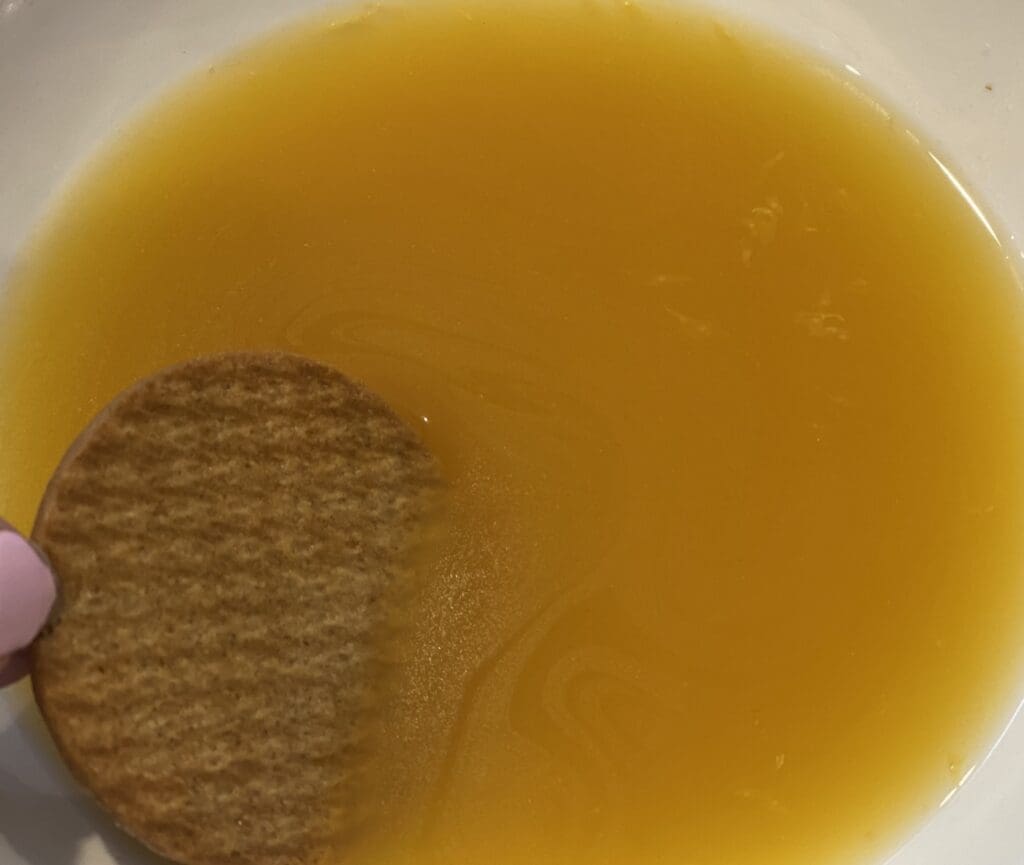 - In a small bowl, combine the orange juice and brandy (if using). Quickly dip a biscuit, then place 1 tbsp of filling on the flat side of the biscuit and place it upright on the cream. Do the same for the second biscuit, then stand it next to the first biscuit and press it gently together. Repeat this same process with the remaining biscuits until it forms a log.