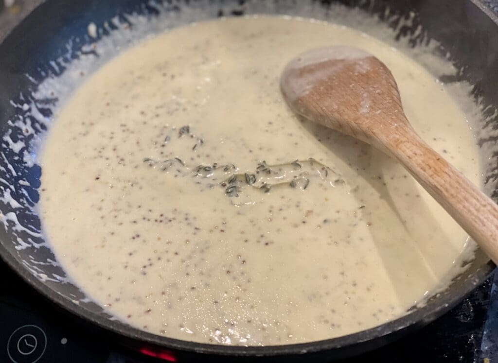 - Preheat the grill/broil or top element in the oven on high heat. Be sure to stay within your pan's heating recommendation, as high heat may damage your pan.Reheat the oil over medium-low heat, then stir in the garlic for a minute or until fragrant. Pour in the cream, then add the thyme, dijon, wholegrain mustard, salt, and pepper. Once the sauce has heated through, add the chicken and its remaining juices. Reheat the chicken on each side for 2 minutes. Have a taste of the sauce, and add more salt and pepper to your liking if needed.