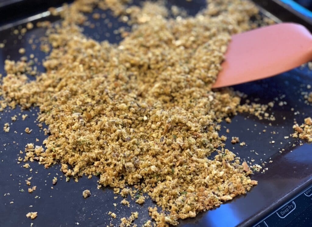 - Spray a large baking tray with oil, then sprinkle the breadcrumbs mixture on the tray. Bake for 3 minutes. Use a spatula to loosen the crumbs and set them aside to cool on the tray.