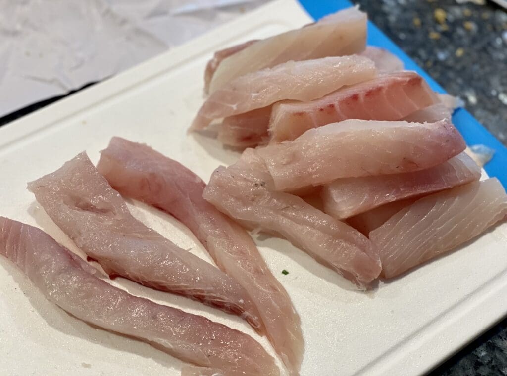 - Slice the fish roughly into 10cm (4in) in length and 1.5cm (0.6in) thick. In a large bowl, whisk flour, egg, mayonnaise, garlic powder, salt and pepper. Add in the fish and mix gently to coat the fish pieces.