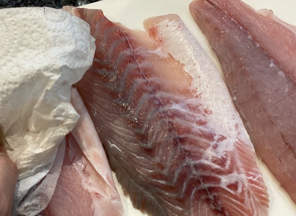 - Pat the fish fillets dry all over with a paper towel and season lightly with salt and pepper. Mix the flour and garlic powder together in a bowl and transfer onto a large plate. Working one fillet at a time, dust the entire fillet in flour and shake off any excess.