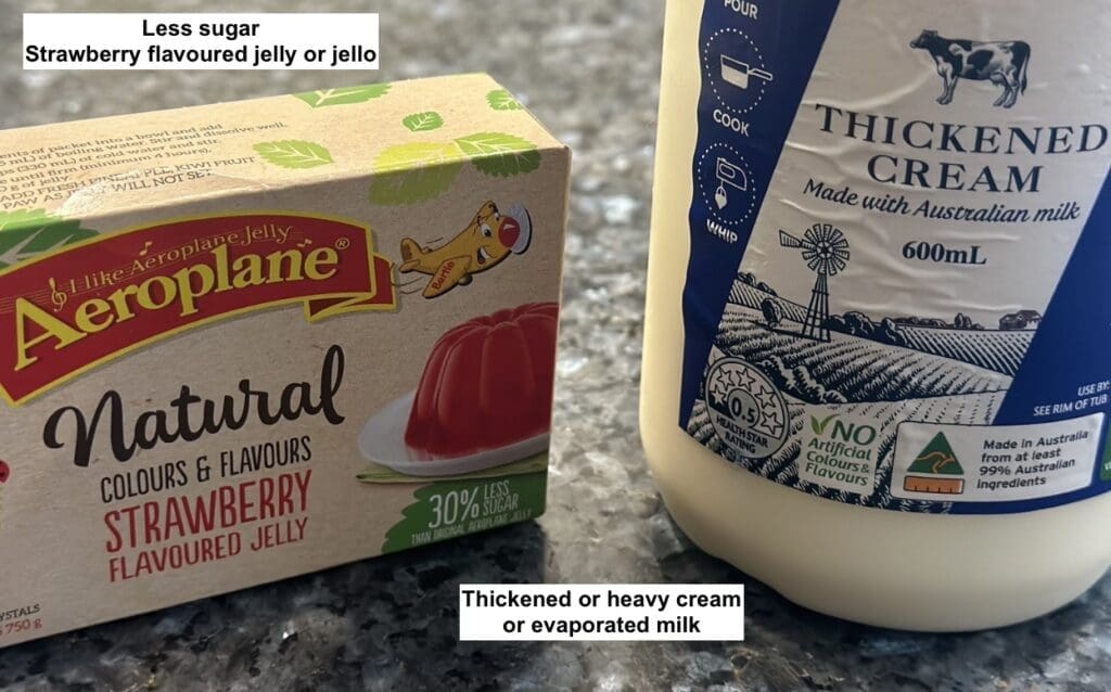- 85gm / 3oz strawberry jelly or jello crystals (or any flavour of choice) (NOTE 1)