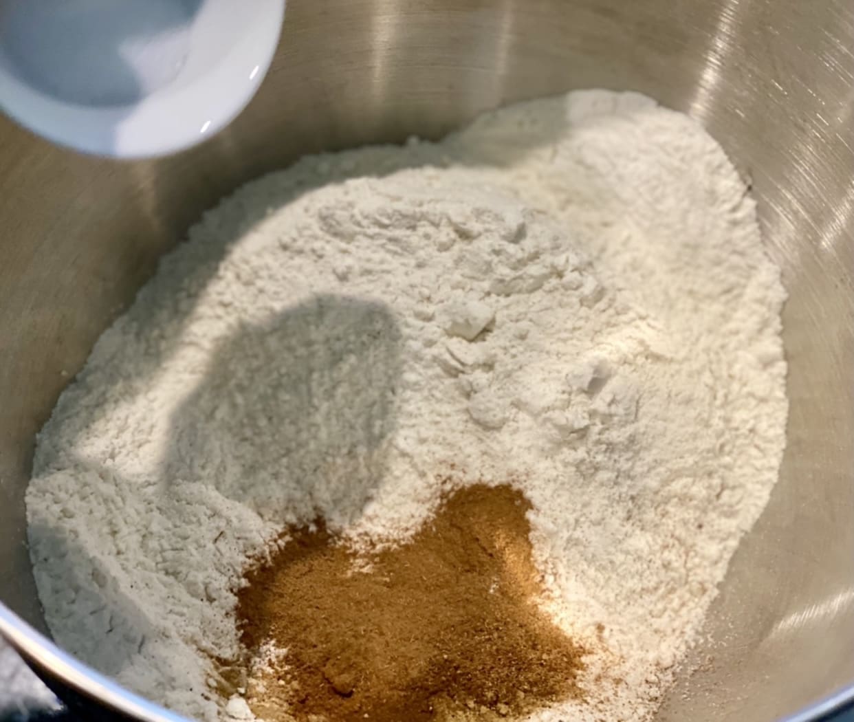 - In the bowl of a stand mixer, place in the flour, sugar, cinnamon, nutmeg, ginger, cloves and salt and give it a quick whisk. Place the butter into the flour mixture and mix it at low speed using the paddle attachment until the flour resembles breadcrumbs.