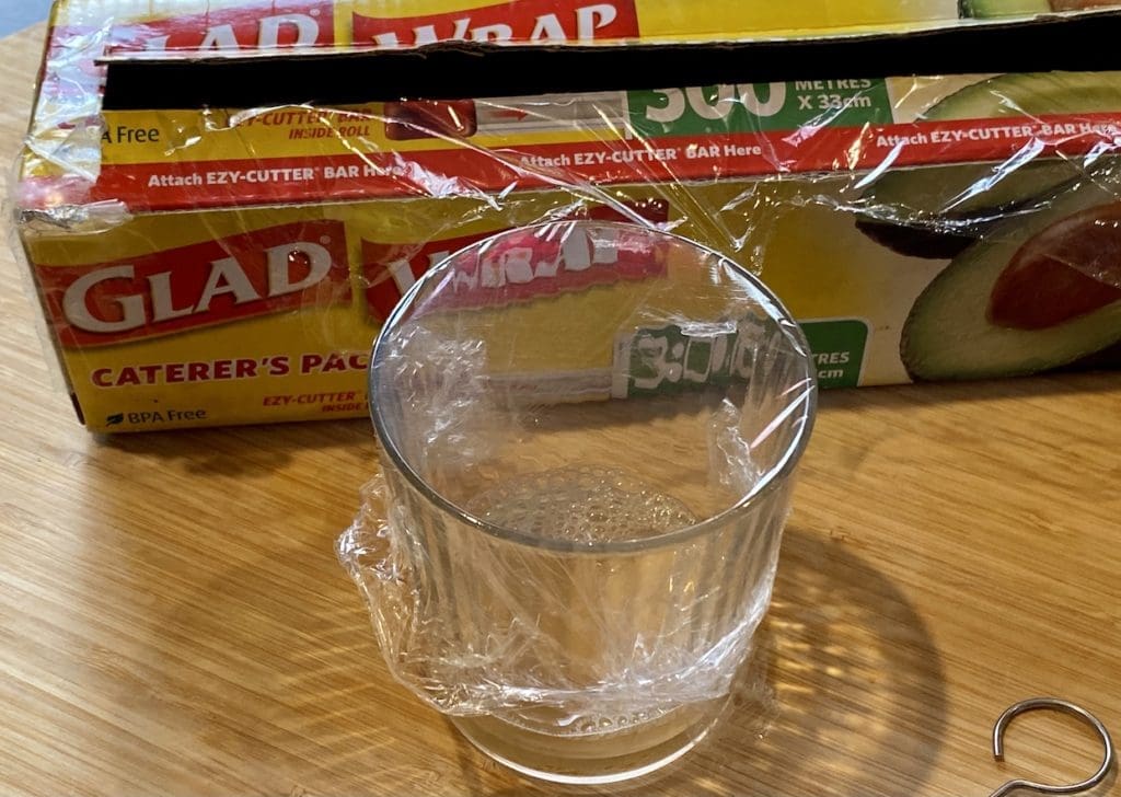 Cling wrap – Is to stop the fruit flies from flying back out of the trap.