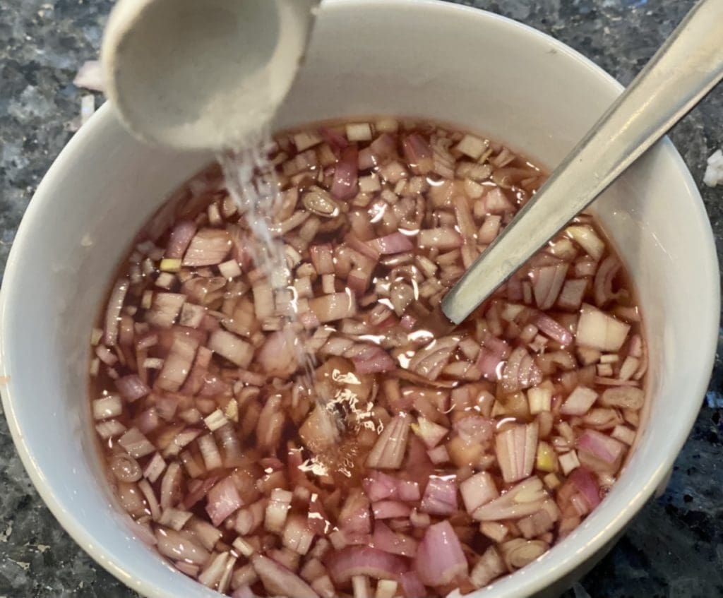 - Combine the red and white vinegar, sugar, salt and pepper in a small bowl. Whisk the sauce until the sugar and salt dissolve, then add in the shallots and give it a mix. Cover bowl and set aside for the flavours to infuse for 30 minutes before serving.
