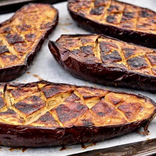 - Preheat oven to 200°C (390°F) or 180°C (360°F) for fan-forced ovens. Cut the eggplants in half lengthwise and score the flesh with deep cuts close to the skin, being careful not to cut through the skin. To make serving the eggplants easier, cut them diagonally to create a diamond shape. Prepare a large baking tray by lining it with baking or parchment paper. Arrange the eggplants with their flesh side up on the tray and brush them with oil. Bake for 15 minutes.