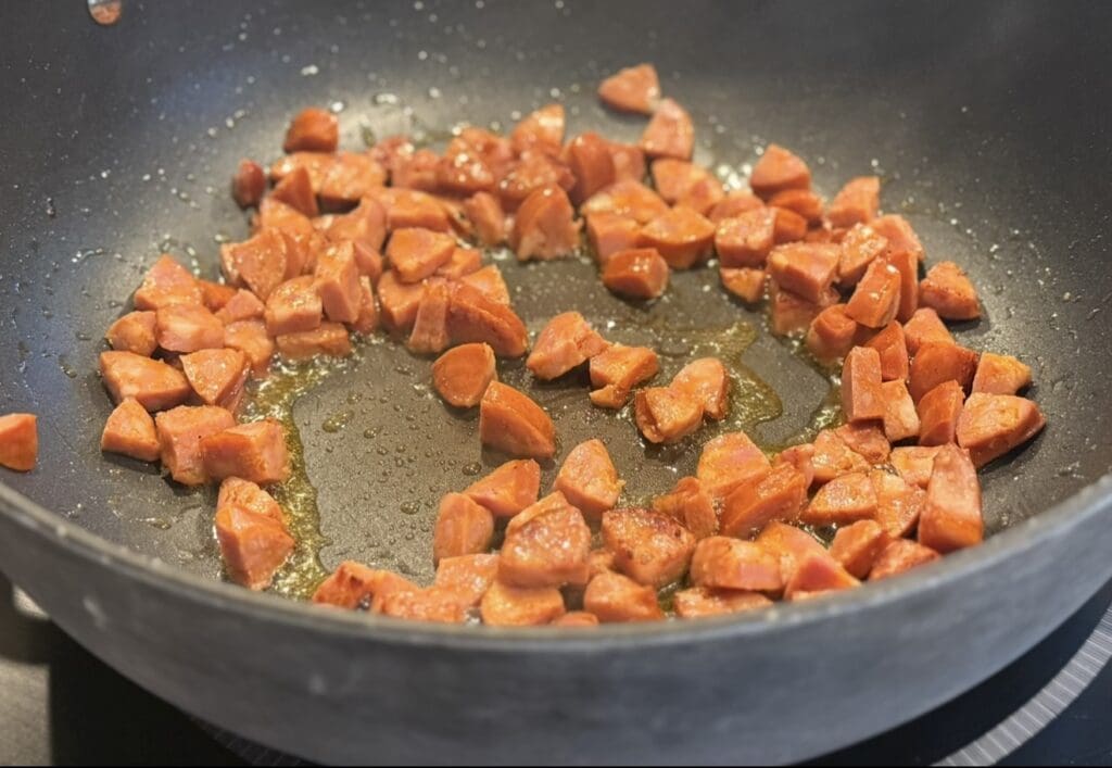 Spanish chorizo – We want the fermented and cured sausage (not the fresh, or raw kind), the ones that are usually vacuum sealed and stored in the fridge. The curing process involves drying and sometimes smoking, resulting in a firm, dry texture. Its flavour is intensely savoury and smoky.