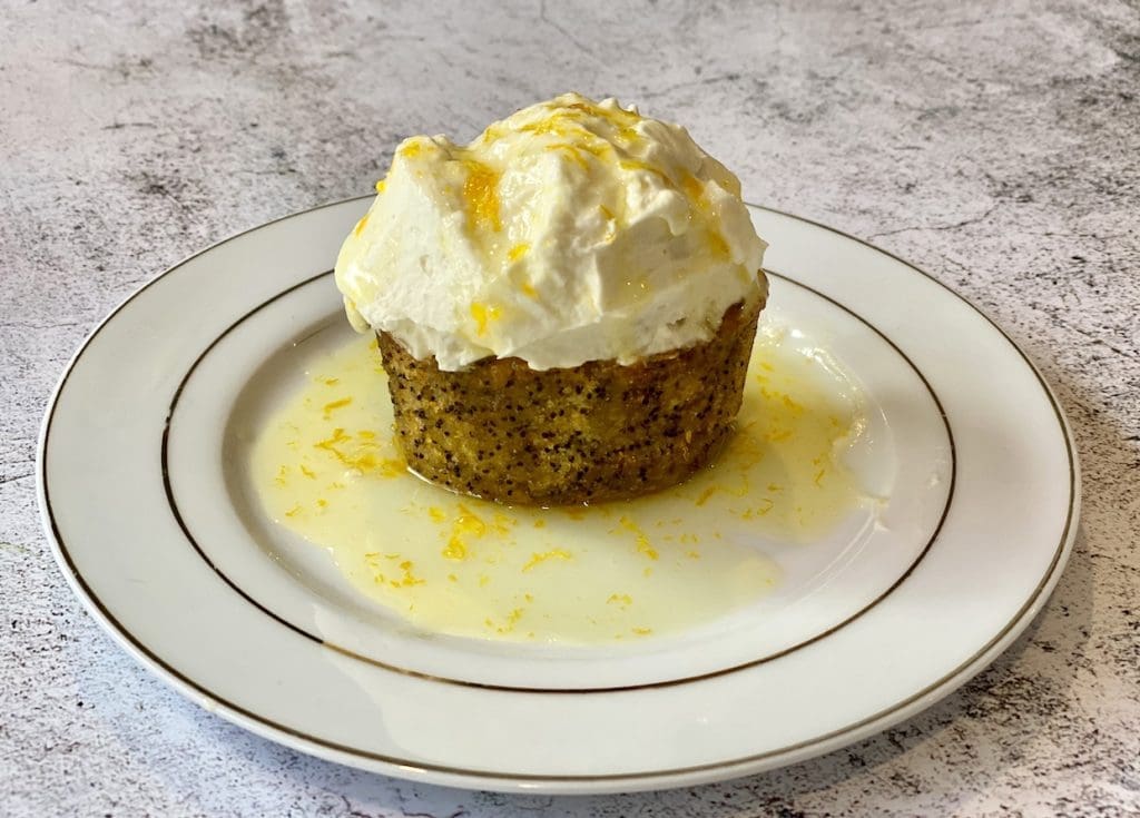 These friands have a thin crusty outer layer with a buttery cake inside that is filled with loads of poppy seeds and orange flavoured goodness. Top it with luscious orange syrup and a generous dollop of whipped cream and you’ll be swearing that you’ve died and gone to heaven!