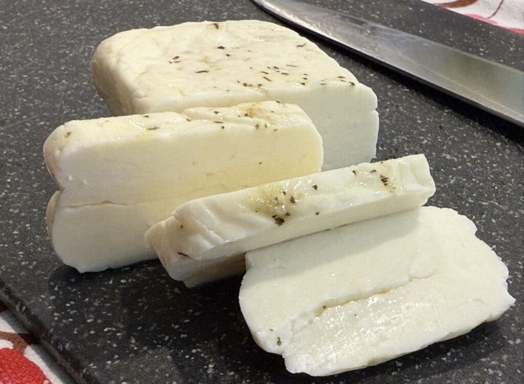 Halloumi from Cyprus has a superior quality, balanced saltiness, and firm, squeaky texture, so it’s the gold standard. If Cypriot halloumi isn’t available, local varieties can still work well, though their flavour and salt levels may differ. Halloumi comes in brine, so dry it well before and after slicing. This helps reduce splatter when pan-frying and ensures a beautifully golden, crisp surface.