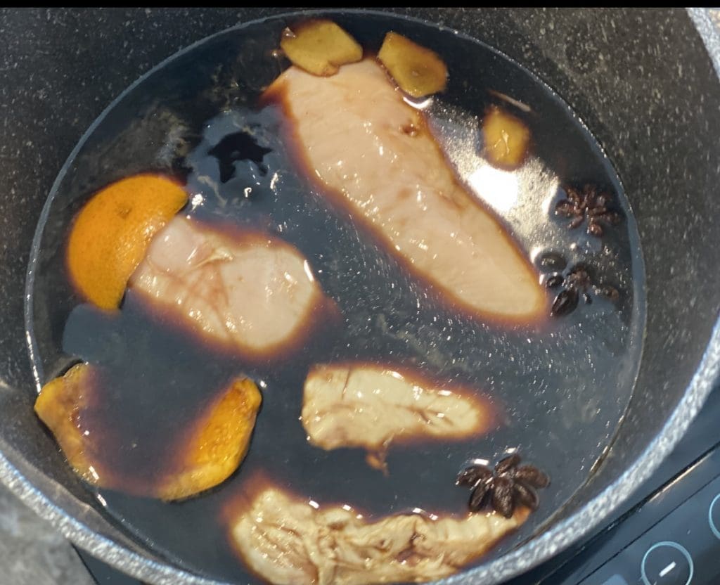 You will have tender and juicy chicken with salty, sweet and aromatic flavours. All thanks to the fragrant spices added to poaching liquid.