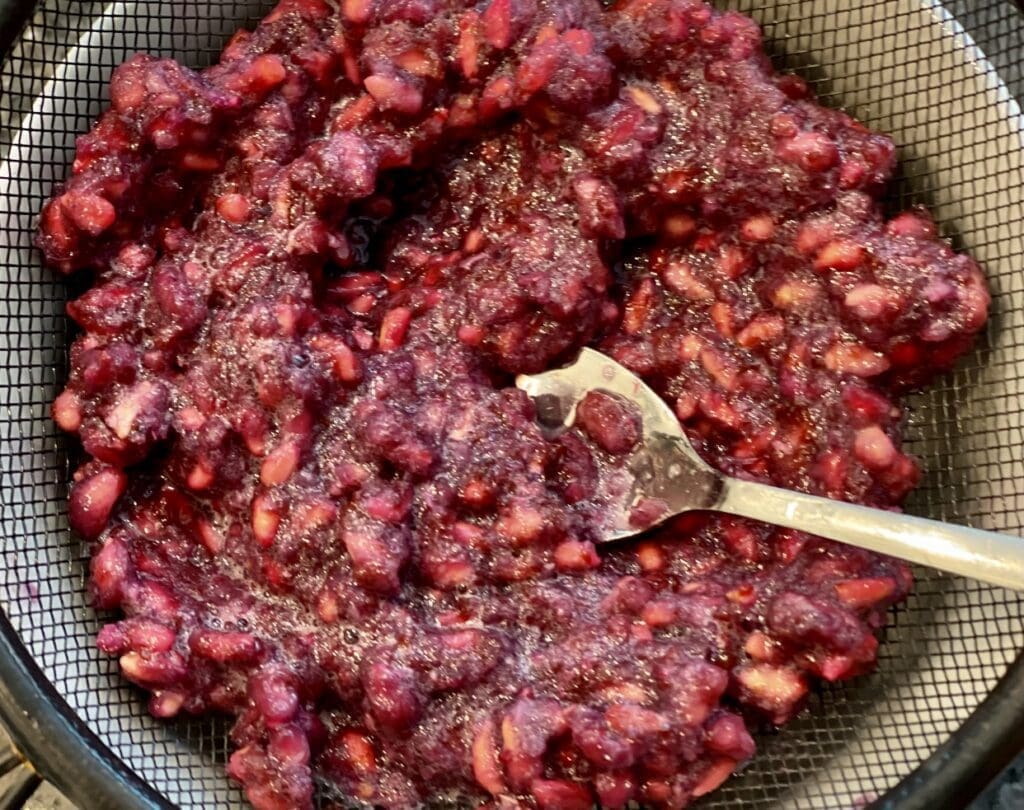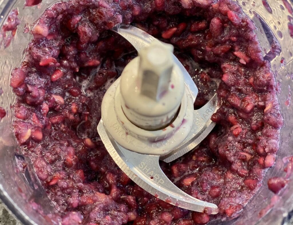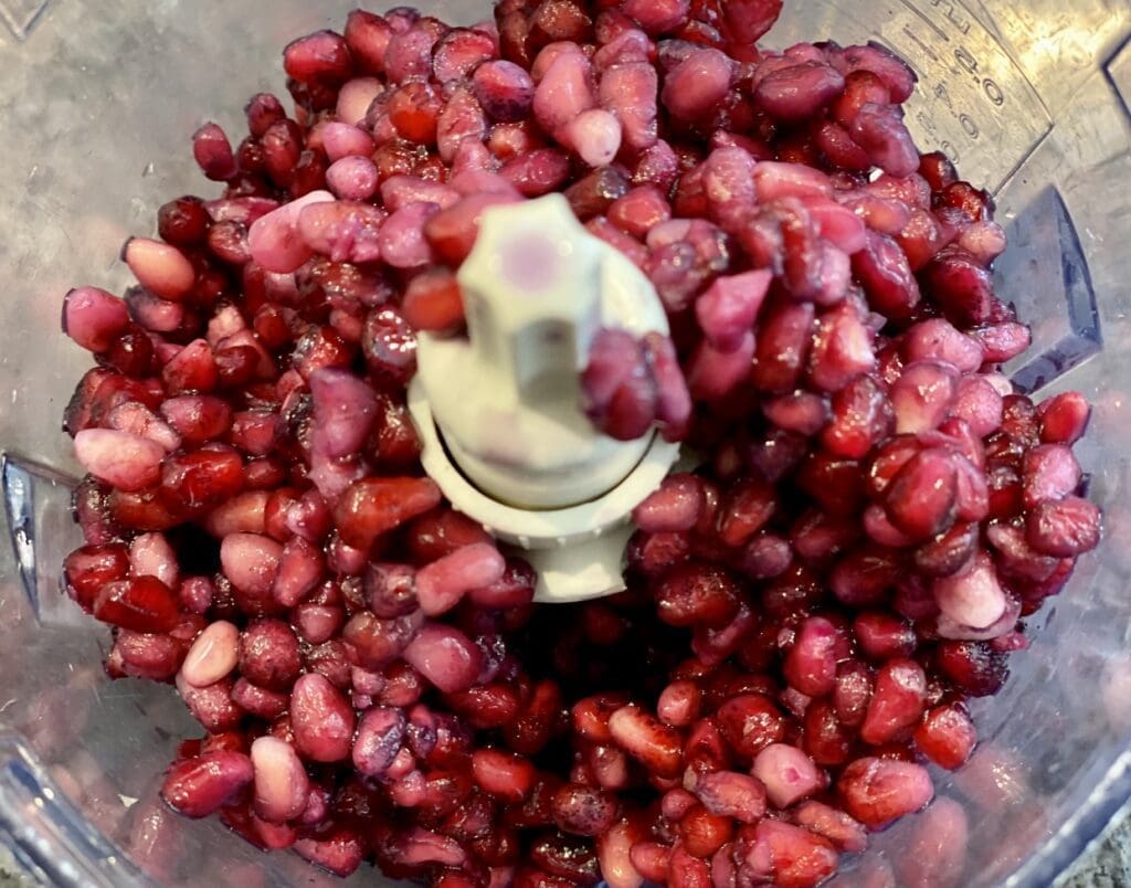 - Make the pomegranate juice – Place the pomegranate arils in a food processor and pulse for a few seconds, 3 or 4 times. Use a strainer to separate the juice from the seed. Use the back of a spoon to push the pomegranate against the strainer, so you can extract all the juice.