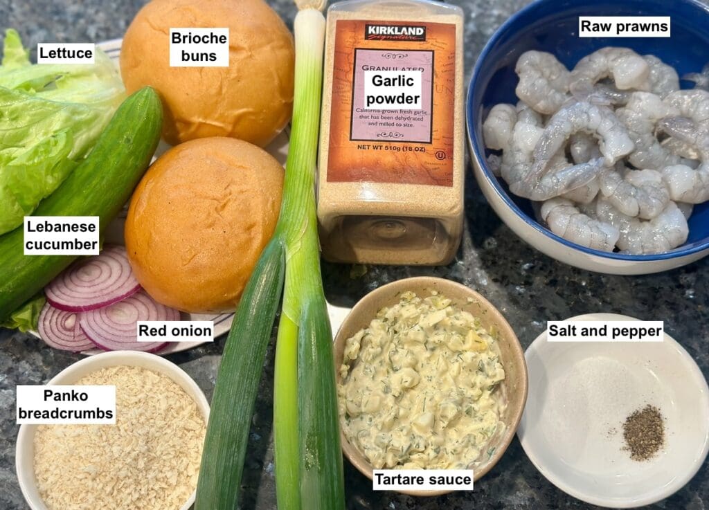 - Toast the burger buns, and spread butter on the insides of the buns. On a plate, arrange the bottom bun halves. Layer with lettuce, onions, cucumbers, prawn patty, tartare sauce, and the top bun.
