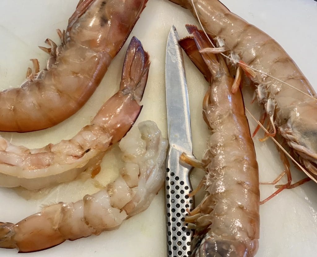 - Peel the prawns, leaving the tail intact. Slice a shallow slit along the back of the prawn and remove its intestinal tract (black line).