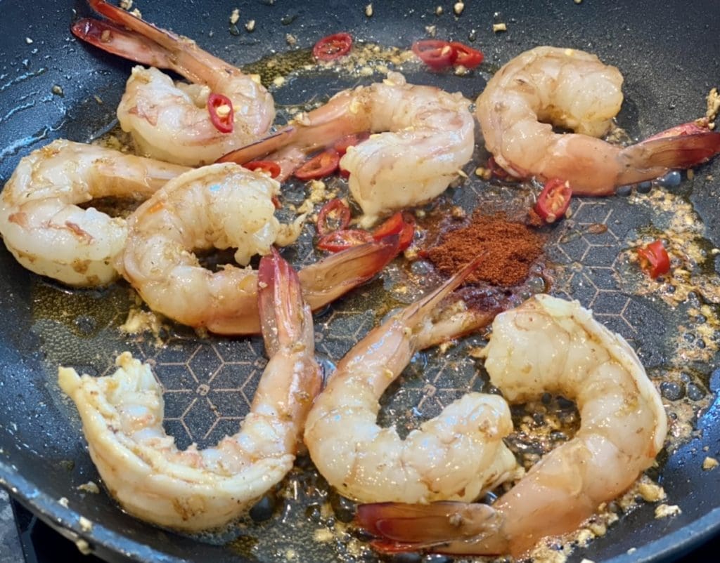 Raw shelled prawns – I used fresh large shelled prawns that weighed approximately 500gm (18oz) in total. Already peeled fresh prawns or defrosted prawns would also work too, but you would only need 300gm (11oz). Devein and clean each prawn before using.