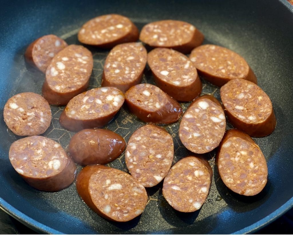 - Slice the chorizos into approximately 0.5cm (0.20in) slices. Heat a large frying pan on medium heat. Place the chorizo in a single layer into the pan and cook for 1 to 2 minutes on each side until slightly caramelised. You may need to do this in two separate batches. Place the chorizo on a plate and set it aside.