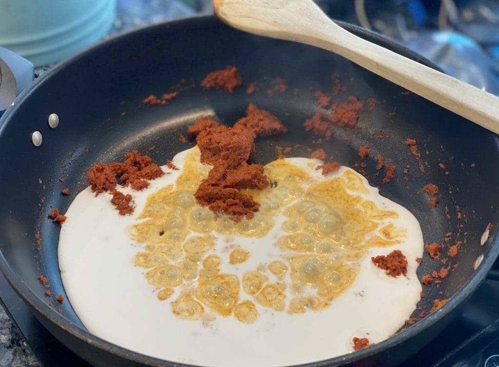 • Heat a deep frying pan or wok over medium to high heat. Add in the curry paste, stir to cook quickly for a minute. Pour in half a cup of coconut cream into the pan, stirring fast to combine the cream with the paste. Bring the mixture to a simmer and let it cook for a minute. Pour the remaining coconut cream and bring it back to a simmer.