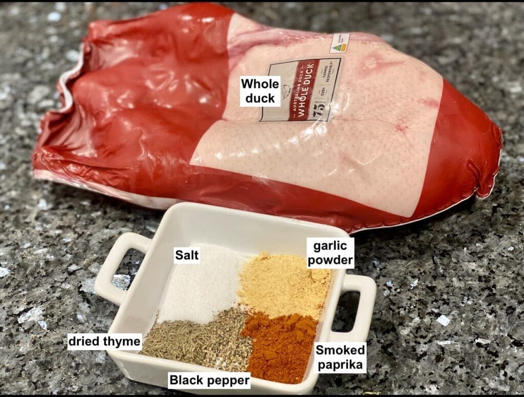 Whole Duck – My duck came frozen, weighing 2.3 kg / 5lb, but anything between 2.3 to 2.5kg / 5 to 5.5lb is fine. I defrosted my duck in the fridge for a couple of days.