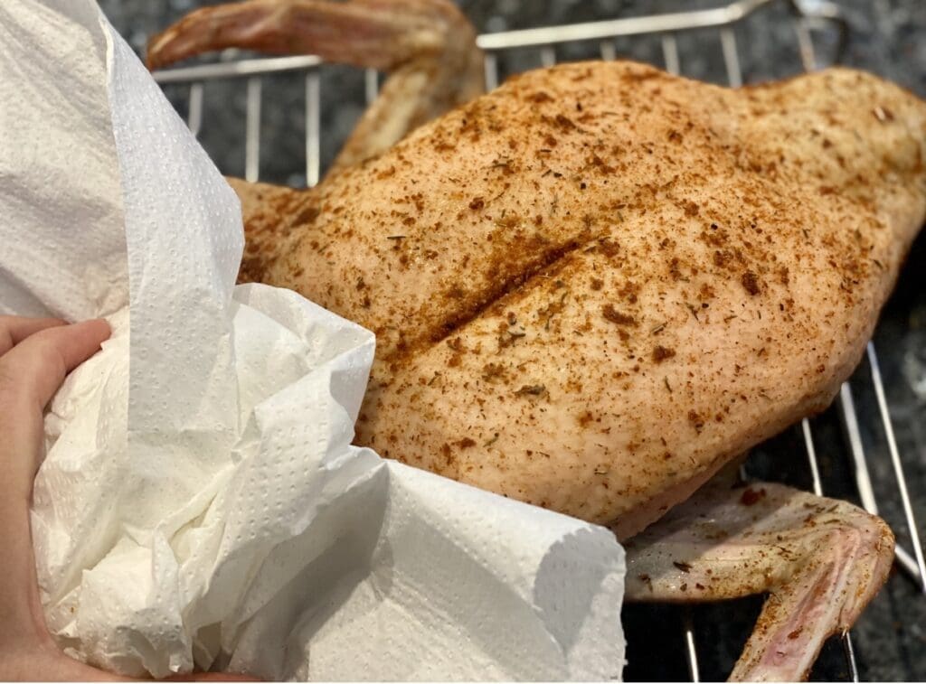 The salt in the dry rub draws moisture from the duck. To dry the duck further, we place it uncovered in the fridge for 24 to 48 hours. During this time, the duck will also absorb some of the salt and flavours from the herbs and spices.