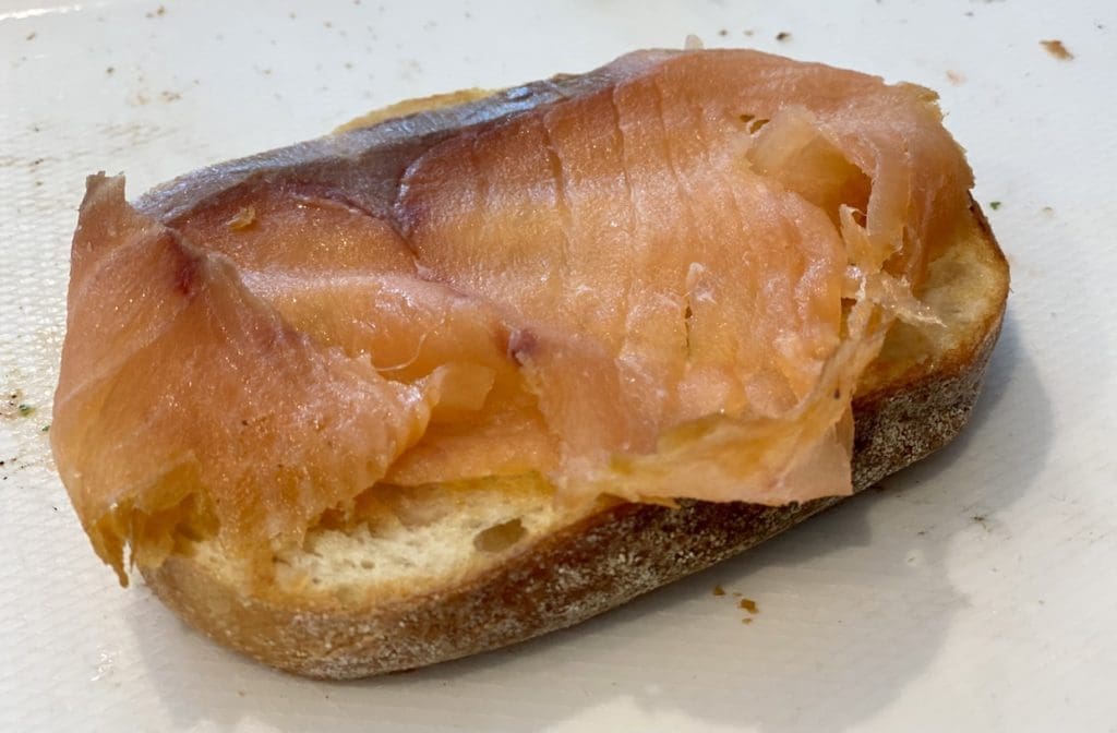 Smoked salmon – Over here you’ll find smoked salmon in the chilled section of the supermarket. Smoked salmon usually has two varieties to choose from. A salmon fillet that looks cooked (nope) and thinly sliced salmon on a cardboard tray that looks raw (get this one!).