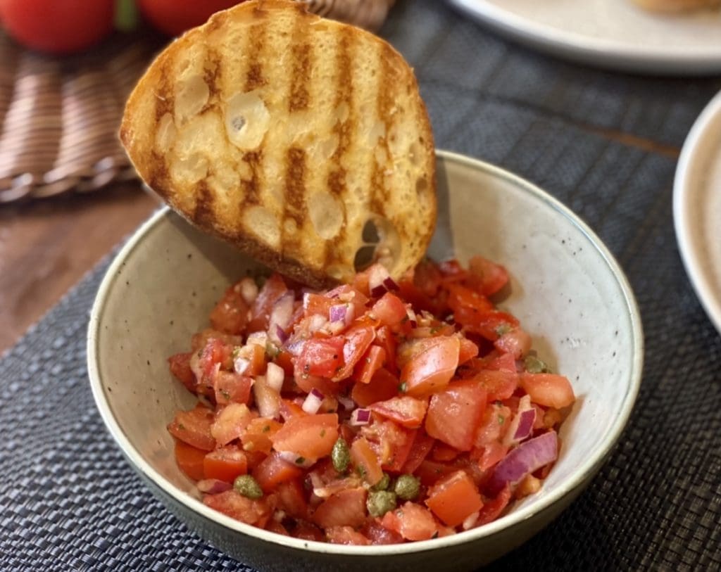 Cut the tomatoes in half and scoop out the seeds with a spoon, this is to reduce the water content that will come out of the tomatoes. Dice the tomatoes in small cubes and place it in a large bowl, add crushed garlic, onion, basil, capers, vinegar and olive oil. Mix gently and set aside for the flavours to develop.