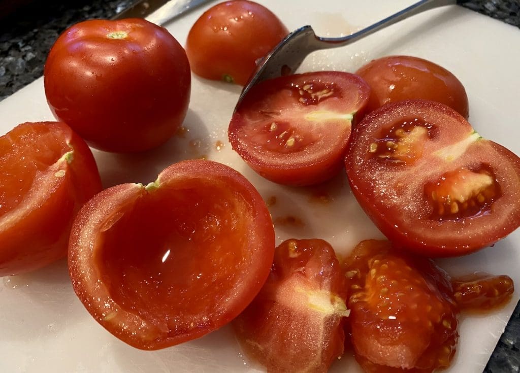 - Cut the tomatoes in half and scoop out the seeds with a spoon. Dice the tomatoes in small cubes and place it in a large bowl, add crushed garlic, onion, basil, capers, vinegar and olive oil. Mix gently and set aside for the flavours to develop.
