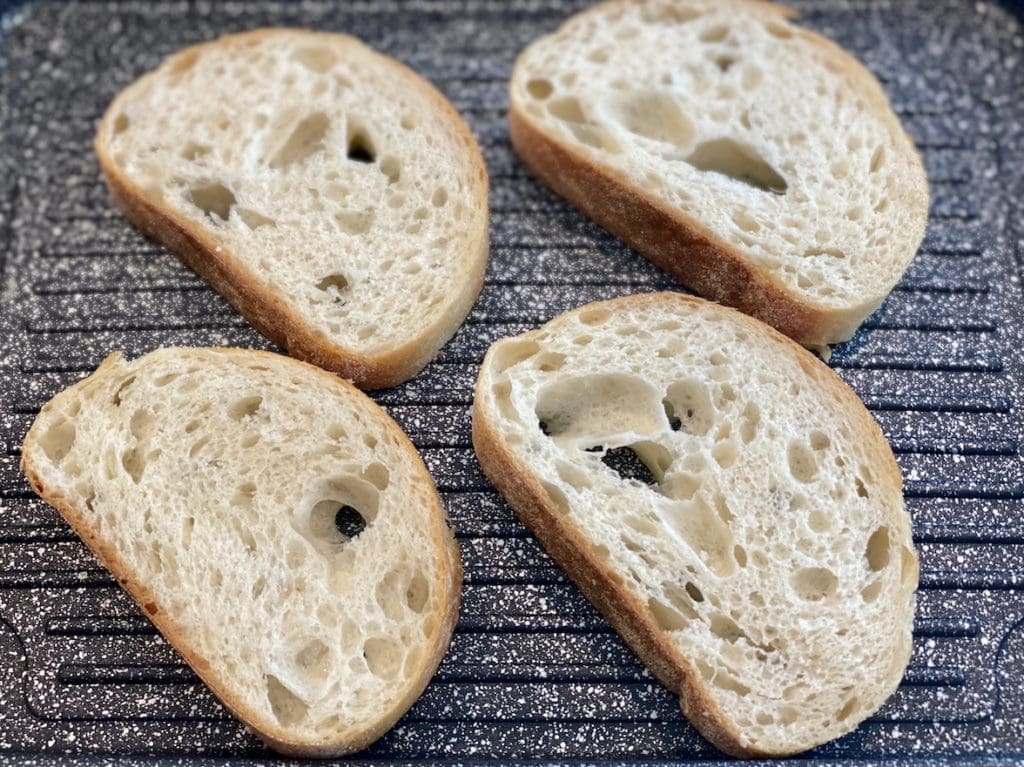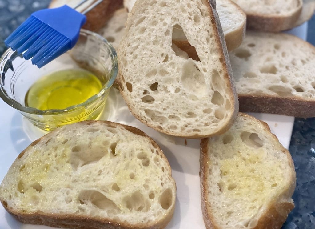 - Heat up the grill on medium to high heat. Slice the bread loaf into approximately 1cm in thickness, lightly brush one side with olive oil. Grill for 2 to 3 minutes on each side or until evenly toasted.