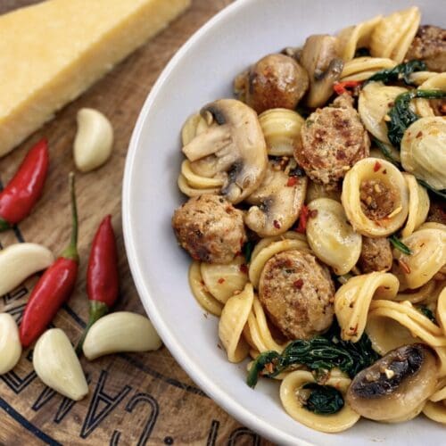 Spicy sausage pasta made with garlic, chilli, fennel seeds, mushrooms & spinach. A quick, flavour-packed pasta ready in less than 30 minutes.