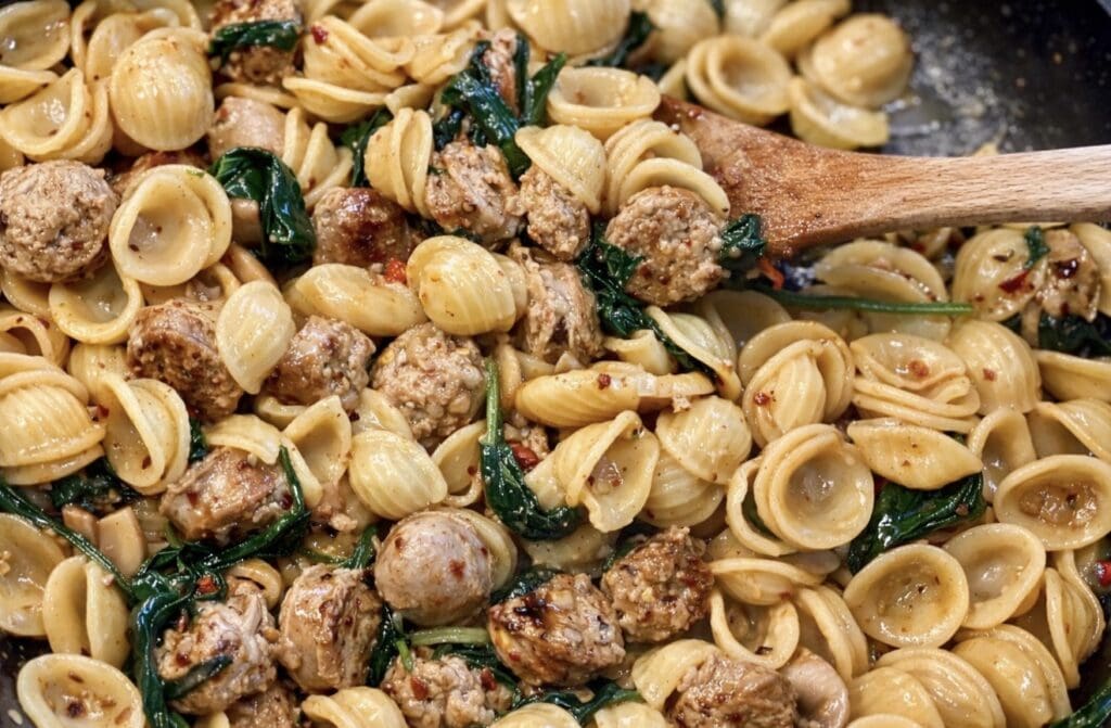 That moment arrived when my husband, Tomasi, came home with some beautiful Italian sausages from our local butcher. Spicy sausage pasta was instantly on my mind, and orecchiette was the perfect match!