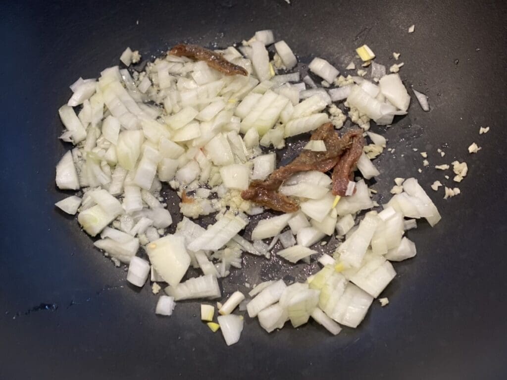 - Heat oil in a large deep frying pan over medium heat. Place in the garlic, onion and anchovies, then stir-fry for a minute. Use a wooden spoon to break up the anchovies into tiny pieces to help them dissolve. Add in the tomatoes and chillies, then stir for another minute.