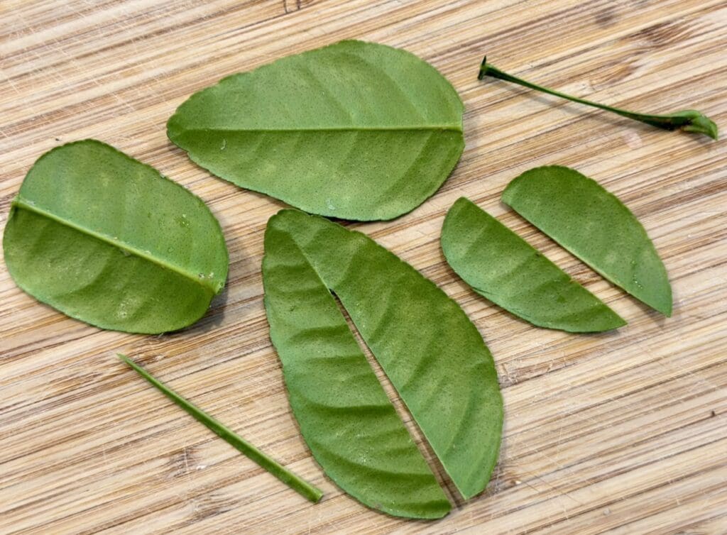 Kaffir lime leaves – A single kaffir lime leaf looks like there are two leaves conjoined together. These leaves are aromatic with a unique spiced citrus flavour. Greengrocers usually stock kaffir lime leaves near their herb section.