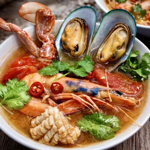 This Thai seafood soup is spicy, fragrant and packed with prawns, fish, mussels, squid and crab. An easy homemade recipe that beats takeout.